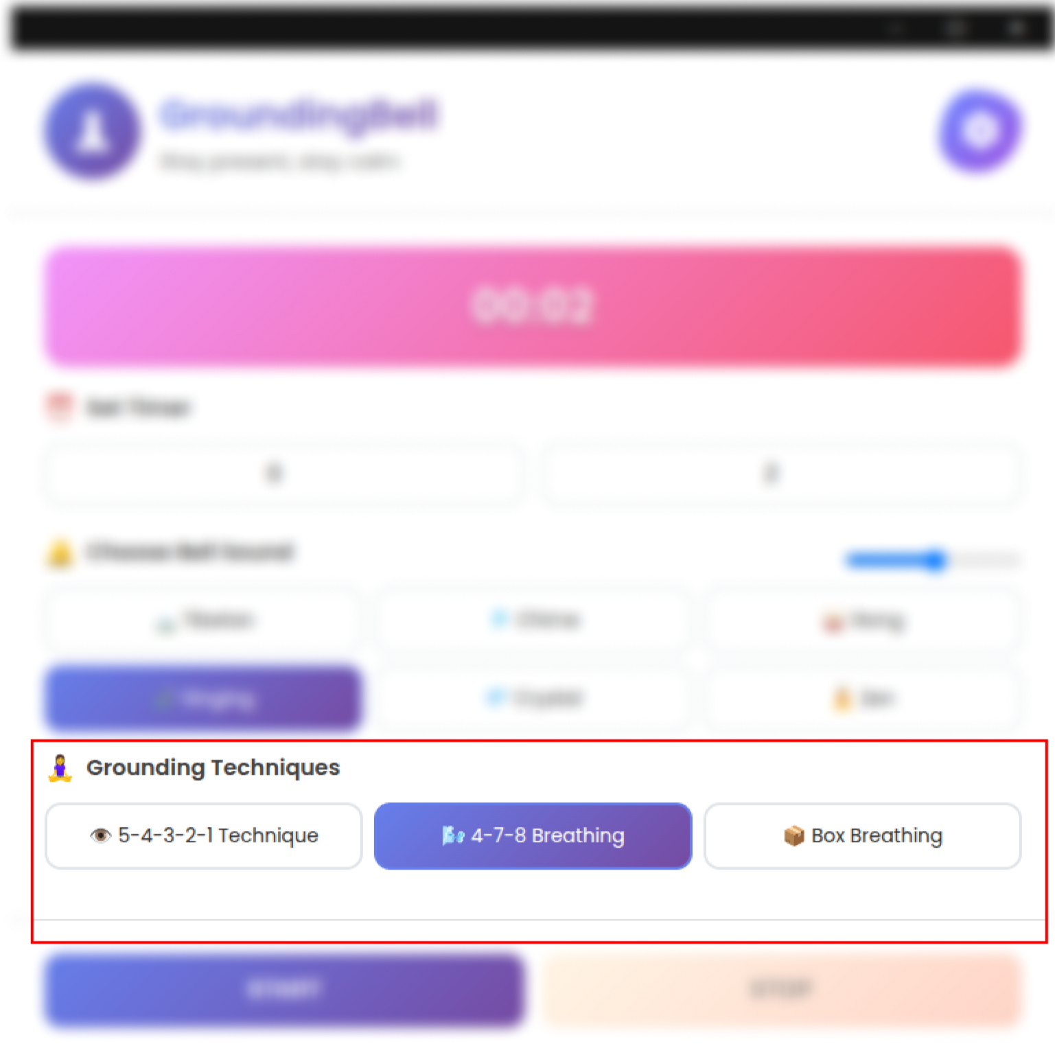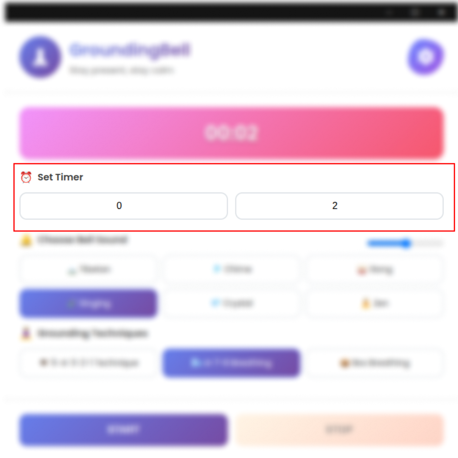 Set a timer for however long you'd like, and GroundingBell will automatically alert you when it's time for a guided grounding exercise.