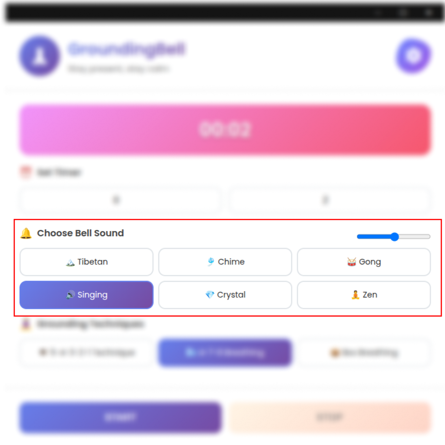 Set a timer for however long you'd like, and GroundingBell will automatically alert you when it's time for a guided grounding exercise.